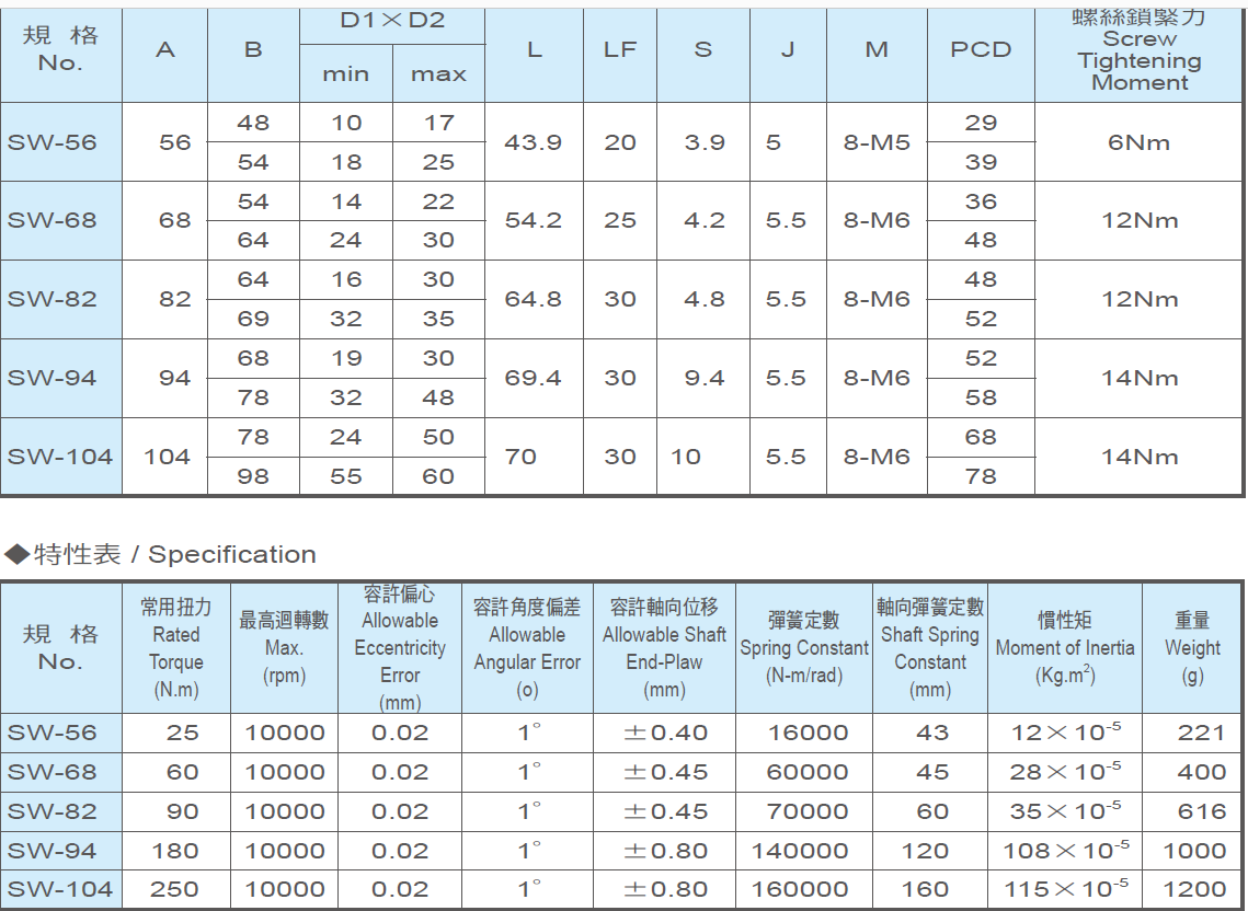 仕勛SW-56 SW-68 SW-82 SW-94高剛性.高扭矩聯(lián)軸器是連接兩軸使之供回轉(zhuǎn)並傳遞安全轉(zhuǎn)矩的一種機(jī)械裝置。一般聯(lián)軸器可分為撓性與剛性聯(lián)軸器兩